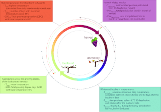 Modern viniculture currently has two major threats: changing attitudes by generations towards wine consumption, and changing vineyards in response to climate change. The latter is properly part of viticulture, and I will look at it here. This topic was something that was long addressed by Dr Richard Smart, who died recently (Richard Smart: the man who changed wine): Smart addressed the impact of climate change on wine regions, suggesting that some areas might become too hot for certain grape varieties, necessitating adjustments in vineyard management and variety selection. He consulted to vineyards to help them adapt by taking measures such as finding suitable new grape varieties for their regions.He was absolutely right; and this is now of particular concern in Europe: Why Europe is the world’s fastest warming continent. Two recent research publications by Elizabeth M. Wolkovich have been more specific, at a global scale. The grapevine characteristics included in her scientific analyses are shown in the first figure. The more detailed of her two articles looks at Uneven impacts of climate change around the world and across the annual cycle of winegrapes (PLOS Climate 539): Anthropogenic [human affected] climate change has uneven impacts across the globe and throughout the year. Such unevenness poses a major challenge for human adaptation, especially for agricultural and other managed systems. Here, we use recent phenological models with a dataset of mean phenology for over 500 cultivars (varieties) to estimate climatic changes in growing regions across the globe for a major perennial crop that has been highly affected by climate change: winegrapes. We examine a suite of grower-relevant metrics, including temperatures during budburst, throughout the growing season and temperatures and precipitation surrounding harvest. We find that climate change has impacted all regions, especially for heat metrics across the full growing season (GDD [see the below graph], maximum temperature and days above 35°C). By far the largest shifts, however, are in European regions, where the number of hot days (>35°C) and maximum growing season temperatures are several standard deviations higher than before significant anthropogenic climate change. Climate change impacts have thus been highly uneven across the world’s winegrowing regions and the impacts are variable across the growing season. The other paper is a review article: The problem of terroir in the anthropocene (Harvard Data Science Review, 7-2). She is particularly concerned about the way in which climate change effects the characteristics that we usually associate with wine terroir. Note also that the Anthropocene is a term used to refer to the period of time during which humanity has become a planetary force of change: Climate is integral to the concept of terroir. With anthropogenic climate change, the terroir of the world’s winegrowing regions is changing, and will continue to change for decades or centuries. Here I show how variety phenology — the timing of major growth and reproductive events including budburst, flowering, veraison, and harvest — is a critical component of terroir and one that is becoming increasingly mismatched due to climate change. The clearest signal of this shift comes from the earlier harvests of wine grapes over the last several decades with harvests 2–3 weeks earlier in France and other regions. These earlier harvests have reshaped the climatic profile under which berries ripen, leading to wines with higher alcohol and shifted phenolic and aromatic attributes. But these shifts also hint at a major way to adapt viticulture to climate change — through matching variety phenology to the current and future climates of established winegrowing regions. Here I show how variety phenology — the timing of major growth and reproductive events including budburst, flowering, veraison, and harvest — is a critical component of terroir and one that is becoming increasingly mismatched due to climate change. I outline how growers and researchers alike can leverage current and new data to help develop a framework to shift varieties with climate change.So, the purpose of these two articles is to point a practical way forward, which we would be best advised to heed. What cultivar we grow where (and thus we value the subsequent wine) will need to be re-evaluated, sooner rather than later.